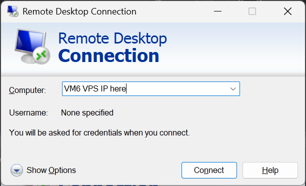 - In the Remote Desktop window, enter your VPS IP address