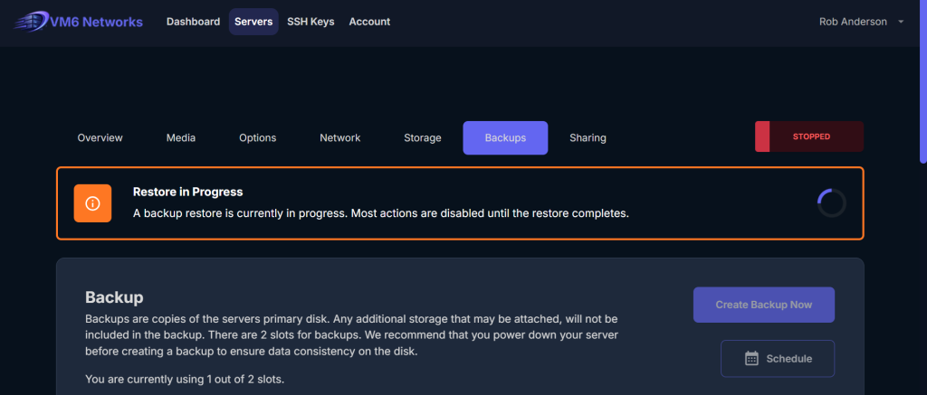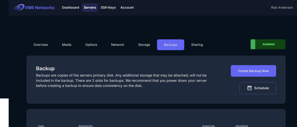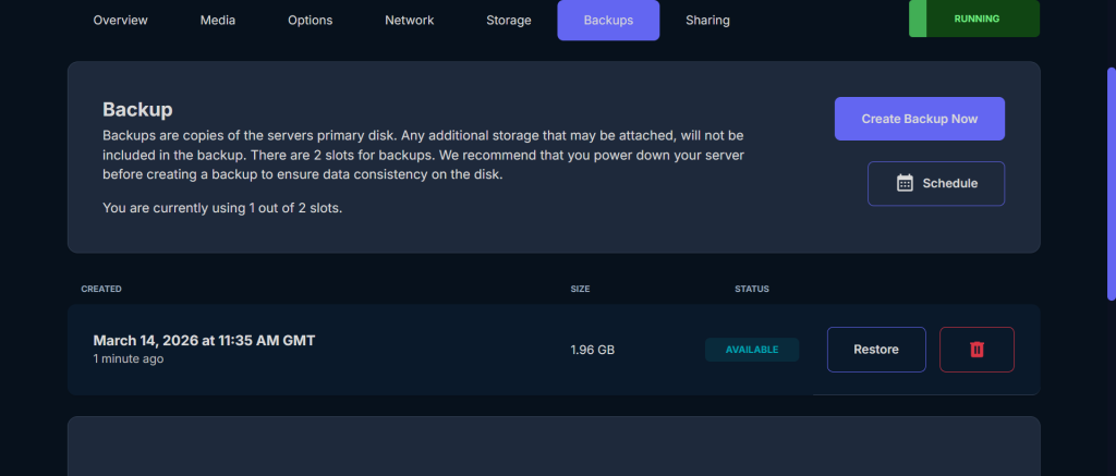 VirtFusion makes it easy to protect your VPS with both scheduled backups and manual backups. We recommend scheduled backups for the best protection, while manual backups are ideal before making major changes.