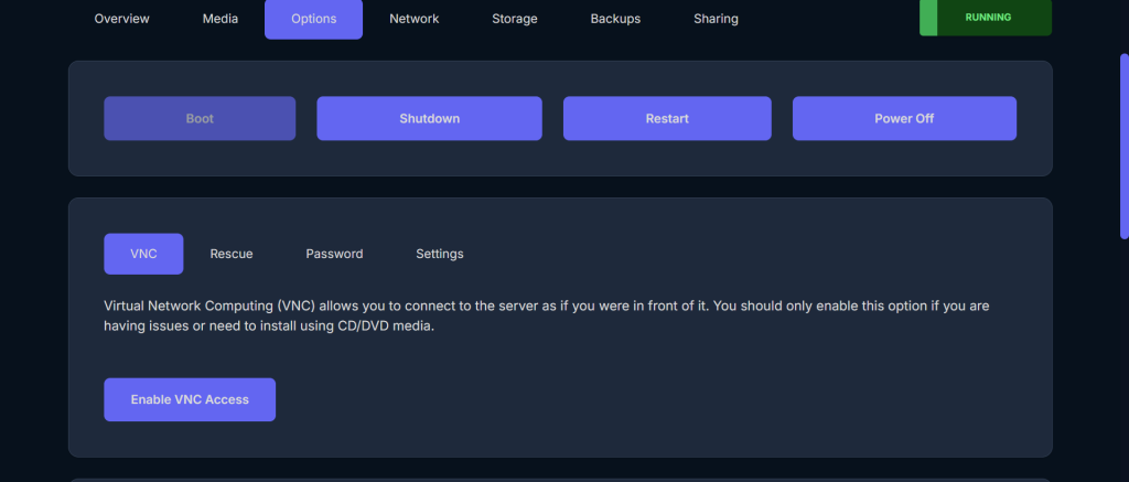 Inside the Options section you will see the VNC control panel.