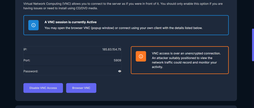 This guide explains how to enable and access the VNC console for your VPS using the VirtFusion control panel. VNC allows you to connect to your server as if you were sitting directly in front of it.