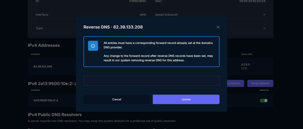 Important: The forward DNS record must exist before setting rDNS, otherwise it may fail.